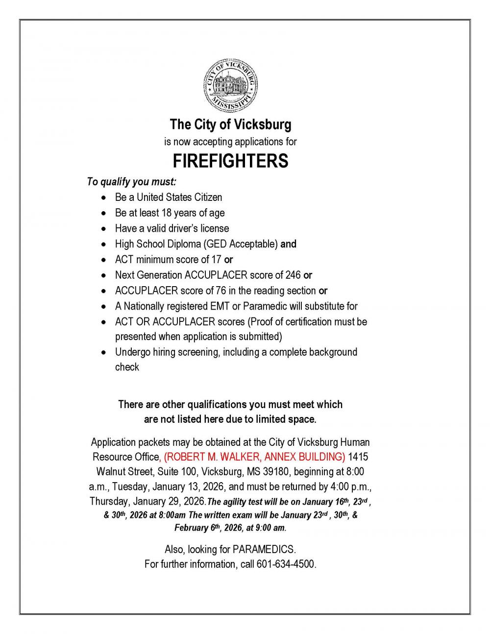 Application packets may be obtained at the City of Vicksburg Human Resource Office, (ROBERT M. WALKER, ANNEX BUILDING) 1415 Walnut Street, Suite 100, Vicksburg, MS 39180, beginning at 8:00 a.m., Tuesday, January 13, 2026, and must be returned by 4:00 p.m., Thursday, January 29, 2026.The agility test will be on January 16th, 23rd , & 30th, 2026 at 8:00am The written exam will be January 23rd , 30th, & February 6th, 2026, at 9:00 am.
